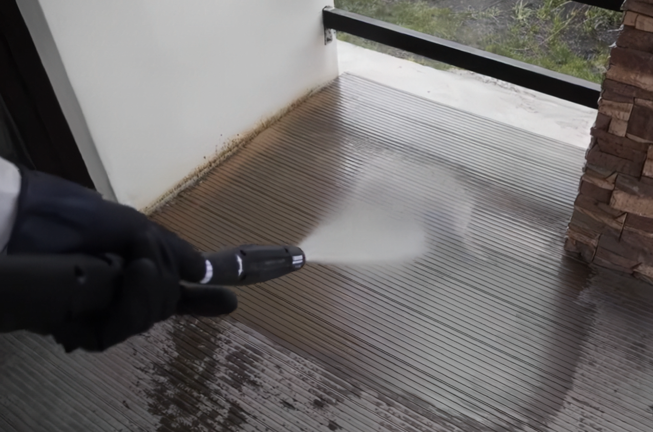 Мойка высокого давления. Минимойка справляется с въевшимися загрязнениями и убирает потемнения. Используйте насадку с веерной струёй, держите расстояние не менее 30 см от поверхности и направляйте струю вдоль волокон. Давление не должно превышать 100–120 бар. Агрессивная точечная струя повреждает защитное покрытие доски.