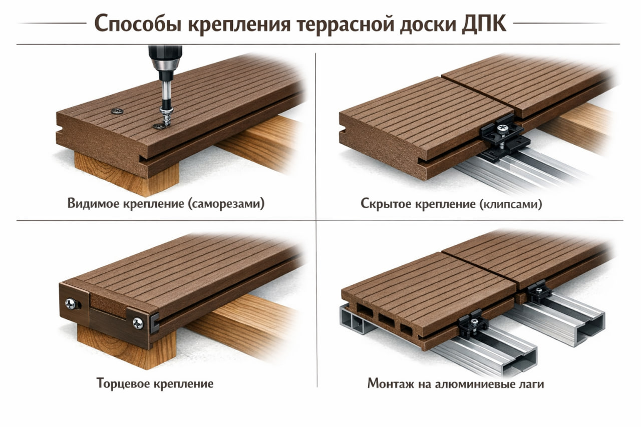 Важно помнить: итоговая несущая способность настила зависит не только от доски, но и от правильно смонтированной подконструкции. Лаги из алюминия или того же ДПК, правильный шаг и надёжное крепление к основанию — залог долговечности всей террасы.